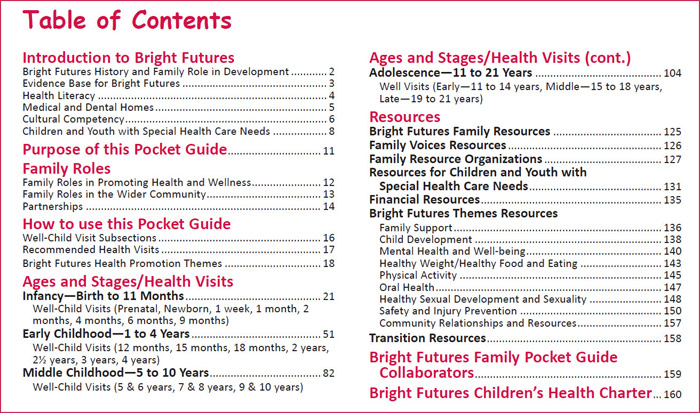 "The Bright Futures for Families Pocket Guide puts highly relevant health promotion material in an easy to use, accessible format. The guide facilitates communication between families and providers and strengthens parent-provider relationships."